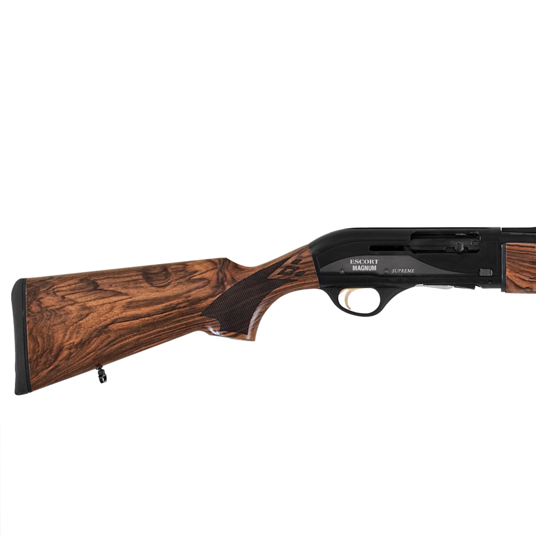 Hatsan Escort Supreme je poluautomatska lovačka puška koja spaja robustan gasni sistem sa profinjenim izgledom: visokosjajni turski orahov kundak i prednja drška, glossy receiver i cijev te zlatno pozlaćeni okidač stvaraju premium dojam, dok su hvaljene funkcionalnosti dizajnirane za stvarni rad u polju — od mogućnosti gađanja 3” magnum patrona do brzog punjenja i praktičnih dodataka (produžna cijev, migracijski plug, magazinski cut-off). Precizno izrađeni ventilirani rib i fiber-optic prednja perla olakšavaju cilj, a čelično-krom-molibden cijevi su izdržljive i otporne na oksidaciju. Puška dolazi sa podešavanjima dužine držanja, gumom za ublažavanje trzaja i kompletnom ponudom choka za različite zadatke — od poljskog lova do zahtjevnih magnum situacija.