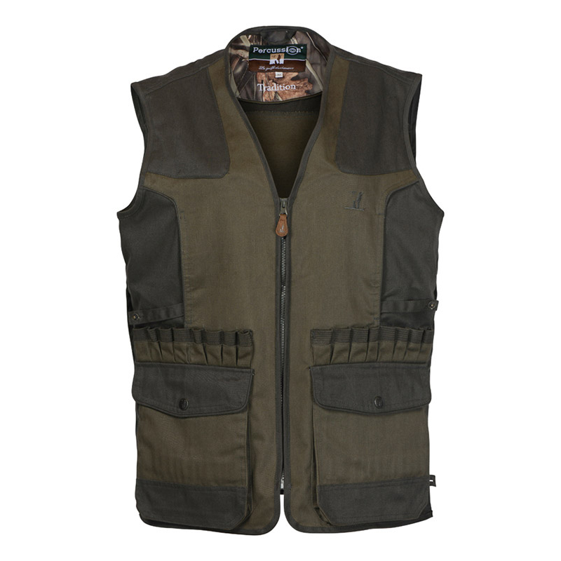 Percussion Tradition prsluk izrađen je od 65% poliestera i 35% pamuka, s vodoodbojnim premazom koji pruža zaštitu u promjenjivim vremenskim uslovima. Ojačanja na ramenima osiguravaju dugotrajnost, dok džepovi za odmor ruku i veliki donji džepovi s integrisanim držačima za patrone (za kugle i sačmu) nude praktičnost tokom lova.
